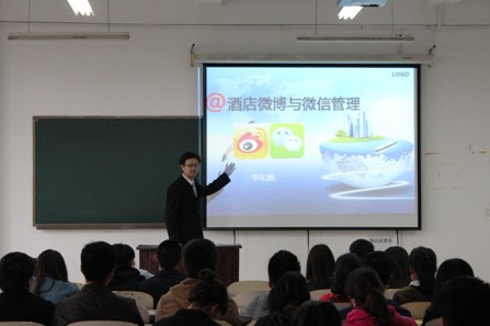 4月17日下午,旅游与3044am永利集团3044noc在A楼303教室举办了主题为“酒店微博与微信管理”海斯曼课堂活动,本次讲座由酒店信息化应用中心李东旭老师主讲。酒店管理专业、酒店信息化协会八十余位同学认真聆听了本次讲座。