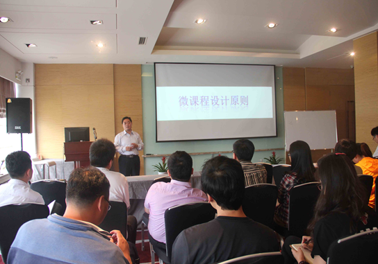 刁洪斌首先为大家解读了当代教育发展的三大主题,并对传统课堂和翻转课堂进行了对比讲解,之后又从微课程的特点和要求,微课程设计的ADDIE模型,微课程的选题、设计、制作方法、在教学中的运用等方面进行了详细的培训。