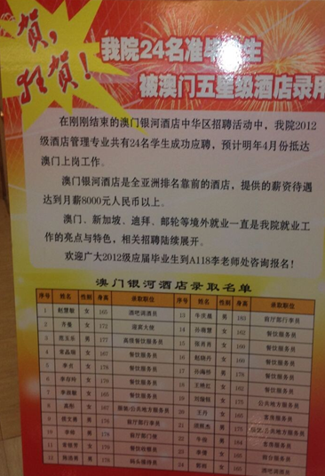 在刚刚结束的澳门银河酒店中华区招聘活动中,公司2012级酒店管理专业共有24名员工被录取,录取率高达70%,创近几年公司境外就业项目录取率新高,更是此次银河酒店中国北方区面试的录取冠军,在参加应聘的同类职业院校中名列第一。