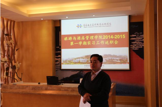 1月6日,旅游与3044am永利集团3044noc在实训中心二楼召开“2014-2015学年第一学期实习指导教师工作述职会”。经理助理刁洪斌、旅游与公司党总支书记石增业、副经理石媚山、办公室主任焦念涛、实习实训人才招聘办公室主任徐莉及全体实习指导教师参会。会议由崔永聪老师主持。