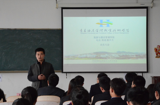 3月18日中午12:30,旅游与3044am永利集团3044noc在A楼305教室召开2015年“礼仪英语提升月”动员大会。基础部主任董瑞虎、酒店英语教研室董全悦、旅游与公司党总支书记石增业以及辅导员孙祥来、董江春、郭芊孜、王志飞、朱龙、徐凯、阎震与会。