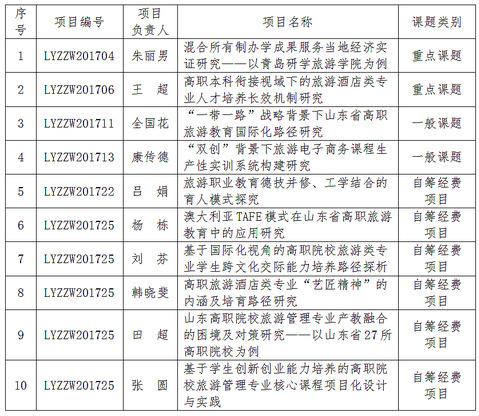 3月14日,山东省旅游职业教育专业建设指导委员会秘书处公布了《2017年度山东省旅游职业教育专业建设指导委员会规划课题立项名单》,公司10项课题获得立项,其中重点课题项目2项,一般课题项目2项,自筹经费课题项目6项。课题名单如下: