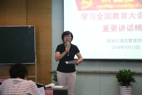 旅游与公司党总支副书记徐莉号召全体教师认真学习贯彻全国教育大会精神,坚持正确政治方向、坚持服务国家、坚持改革创新,工作紧紧围绕立德树人的根本任务展开,以“四有好老师”为标准,做好员工成长成才的引路人。