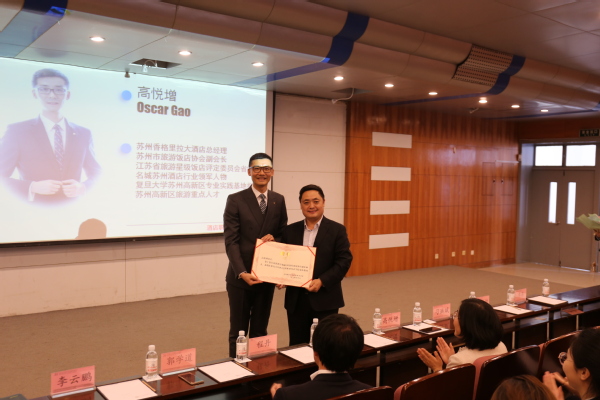刁洪斌为高悦增颁发了客座教授聘书,高悦增为公司400余名教师及员工代表进行了《酒店职业生涯发展与规划》专题讲座。高悦增是苏州市旅游饭店协会副会长、江苏省旅游星级饭店评定委员会省级评定员、名城苏州酒店行业领军人物、复旦大学苏州高新区专业实践基地指导教师、苏州高新区旅游重点人才,他用幽默的语言将自己从餐饮部培训生到“苏香”总经理的职业路程分享给了在场师生,引起了强烈共鸣。