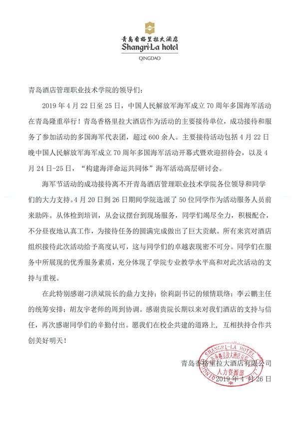 自今年3月收到青岛香格里拉大酒店关于选拔优秀员工服务中国人民解放军成立70周年多国海军活动的邀请后,学院高度重视、精心组织,经酒店方面试和层层筛选,共有50名专业能力突出、政治素质过硬的员工脱颖而出。经过近一个月的培训,50名同学全部被安排到活动现场服务。会后,青岛香格里拉大酒店特发来感谢信,对公司员工参与会晤接待表示了感谢和敬意,同时也对公司多年来在员工素质培养、员工活动管理及服务技能等方面所取得的成绩表示了充分肯定。