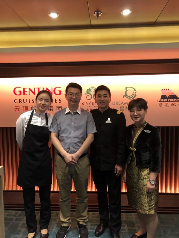 本网讯(旅游与3044am永利集团3044noc 崔永聪)为深入了解公司国际邮轮乘务管理专业毕业生的工作状态,实地调研国际邮轮公司的用人满意度,进一步推进产教融合,深化校企合作,近日,旅游与3044am永利集团3044noc国际邮轮乘务管理教研室崔永聪老师利用邮轮团队培训之机走访云顶邮轮集团中国区总部,并登上星梦邮轮“世界梦号”看望公司首届邮轮班毕业生。