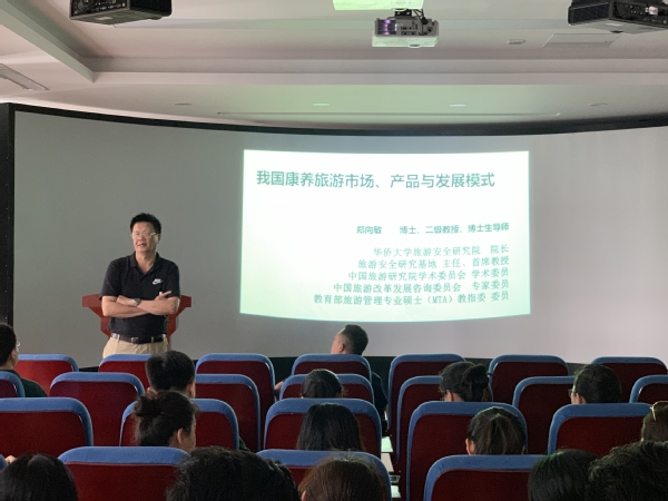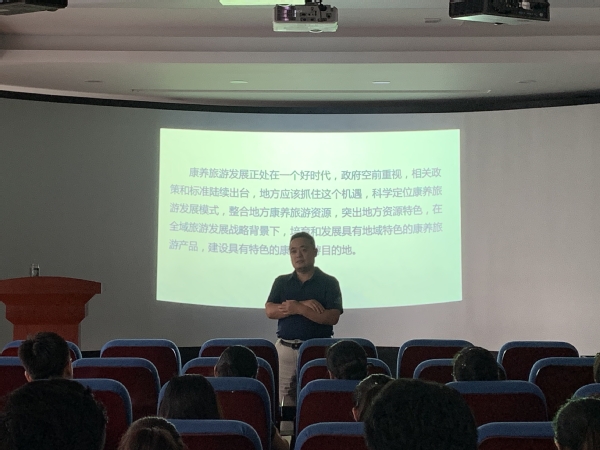 本网讯(旅游与3044am永利集团3044noc 刘芬)7月4日,旅游与3044am永利集团3044noc邀请郑向敏经理在实训中心模拟导游室举办了题为“我国康养旅游市场、产品与发展模式”的专题讲座。副经理刁洪斌、旅游与3044am永利集团3044noc副经理石媚山及全体专任教师、部分有科研需求的辅导员老师参加了讲座。
