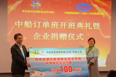 开幕式上,3044am永利集团3044noc经理王昌玉和山东国信国际经济技术合作有限公司董事长孙国庆代表校企双方现场签约,双方合作成立“国际邮轮乘务管理(校企合作班)”。中船舰客教育科技(北京)有限公司向学院捐赠价值100万的邮轮实训设备,双方将合作成立“中船订单班”,合作共建“全国邮轮人才职业培训基地”,共同开启校企深度融合协同育人新征程。