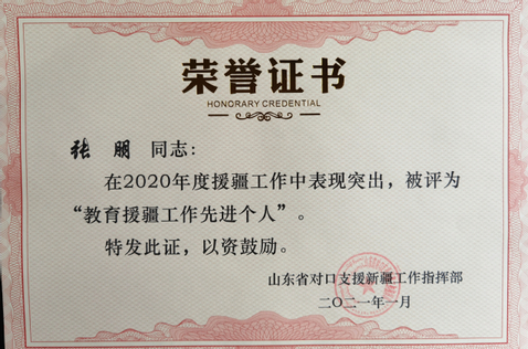张朋用实际行动展现了山东援疆专家良好的精神风貌,展现了我学院教师的扎实作风和家国情怀,受到了当地广大干部群众的认可和高度赞扬,工作成绩多次被山东、新疆两地院校新闻媒体报道。2021年1月,张朋被山东省对口支援新疆工作指挥部光荣授予“教育援疆工作先进个人”荣誉称号。