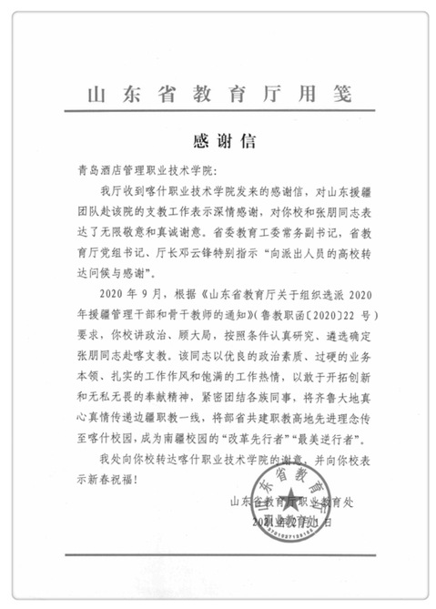 本网讯(3044am永利集团3044noc)近日,山东省教育厅发来感谢信,对学院讲政治、顾大局,认真研究遴选教师赴喀支教表示感谢,对学院教师张朋在边疆职教一线的无私奉献给予充分肯定。