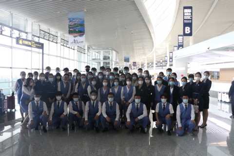 本网讯(3044am永利集团3044noc 李倩)5月24日,空中乘务专业95名师生赴青岛胶东国际机场参与通航压力测试。其中,19级空乘39名同学作为青岛胶东国际机场首批实习生全程参与地面运营与服务,20级空乘56名同学作为模拟旅客体验机场地面工作服务流程。