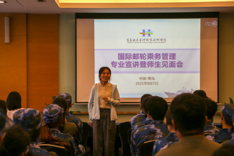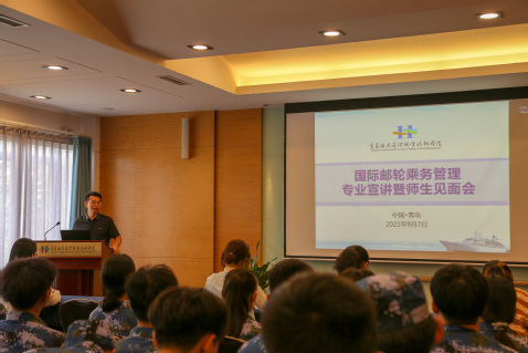 崔永聪代表教研室全体教师对新同学的加入表示热烈欢迎,对本届新生的招生规模和来源作了简要解读,从专业简介、团队力量配备和就业前景等方面进行了详细介绍,并分享了历届邮轮班毕业生成功登轮的优秀案例。