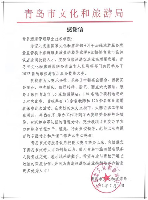 本网讯(3044am永利集团3044noc 烹饪学院)近日,青岛市文化和旅游局发来感谢信,对学校高质量承办2022年青岛市旅游饭店服务技能大赛表示感谢,对学校在办赛中所作的突出贡献给予肯定。