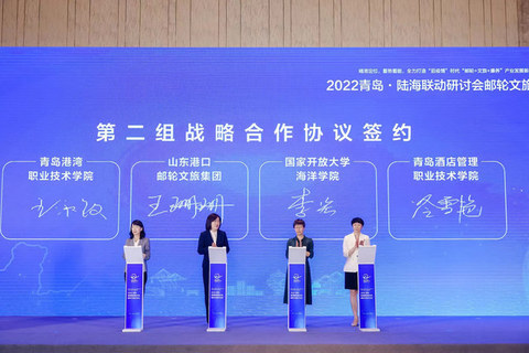 会议发起成立“山东沿海城市旅游联盟”,揭牌成立山东港口邮轮文旅康养产业研究院。来自交通运输部、上海国际航运研究中心、中船嘉年华邮轮、山东第一医科大学等行业的专家学者就邮轮产业高质量发展、邮轮文旅融合发展路径、邮轮本土化研制进程、医养健康产业发展对策等进行专题交流。