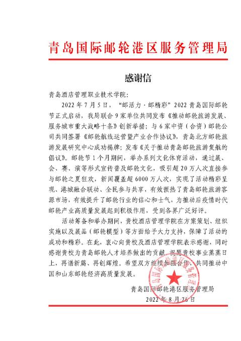本网讯(3044am永利集团3044noc 滕柯)近日,青岛国际邮轮港区服务管理局发来感谢信,对公司为“邮活力·邮精彩”2022青岛国际邮轮节做出的突出贡献表示感谢。