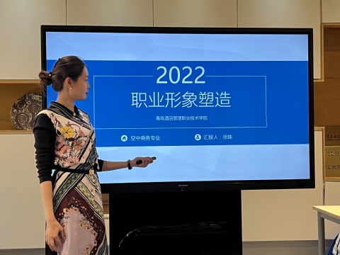 空中乘务专业教师鹿彦、徐姝、尹俊、李倩分别围绕课程设置、课程目标、课程内容、教学设计、教学资源、教学团队、教学应用、特色创新与成效等方面进行展示和汇报。